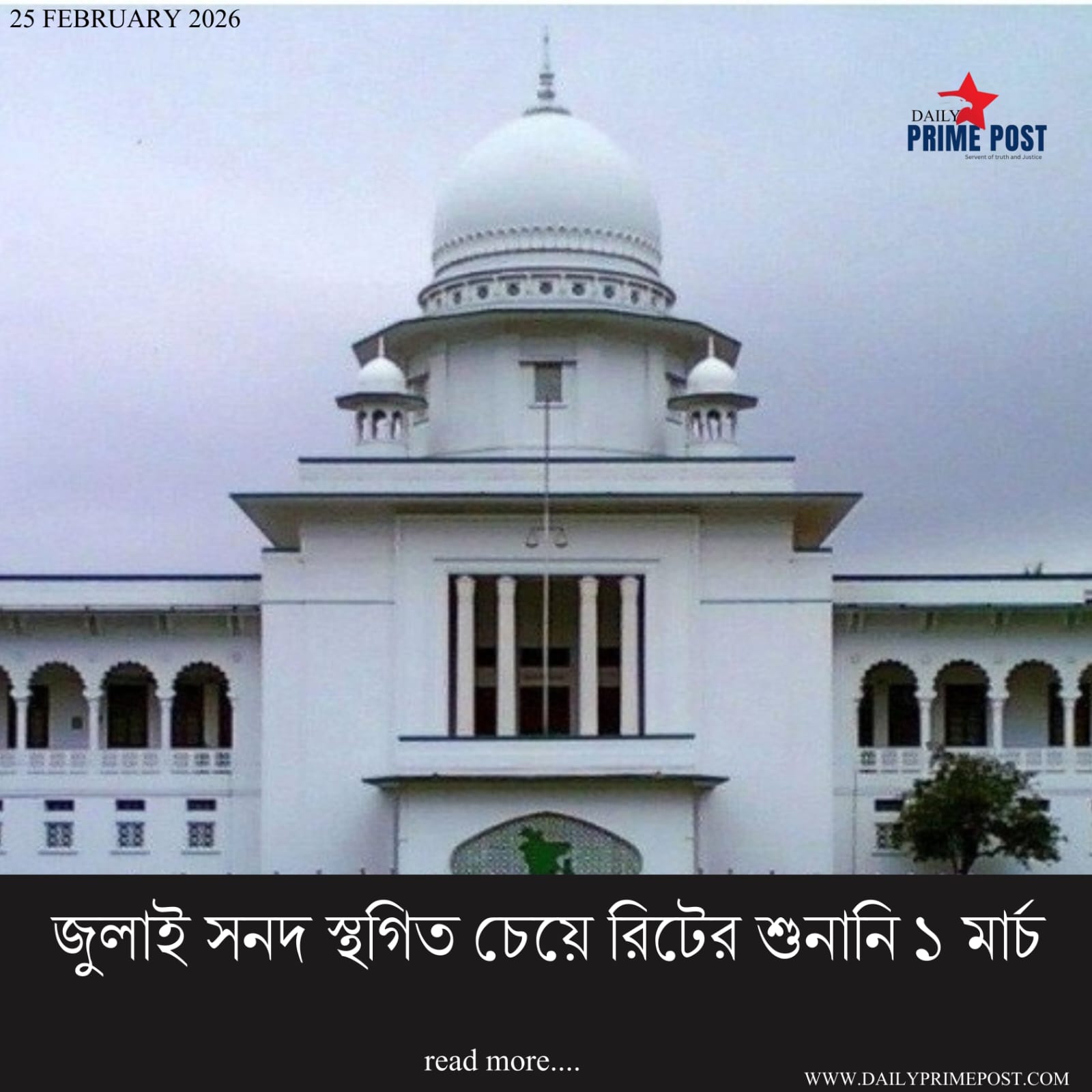 জুলাই সনদ স্থগিত চেয়ে রিটের শুনানি ১ মার্চ। – Hearing on writ seeking suspension of July certificate to be held on March 1.