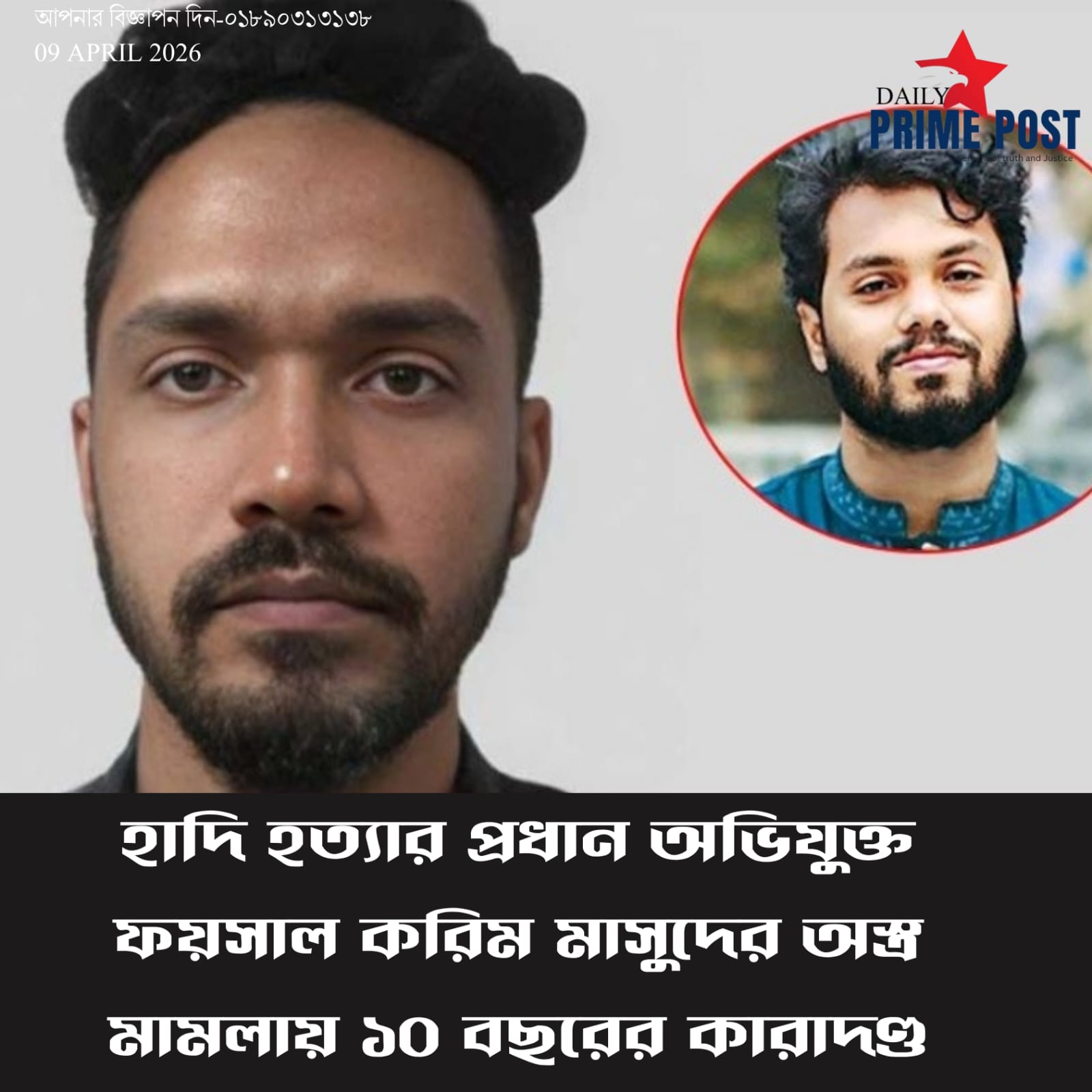 হাদি হত্যার প্রধান অভিযুক্ত ফয়সাল করিম মাসুদের অস্ত্র মামলায় ১০ বছরের কারাদণ্ড। – Faisal Karim Masud, the main accused in Hadi’s assassination, sentenced to 10 years in prison in weapons case.