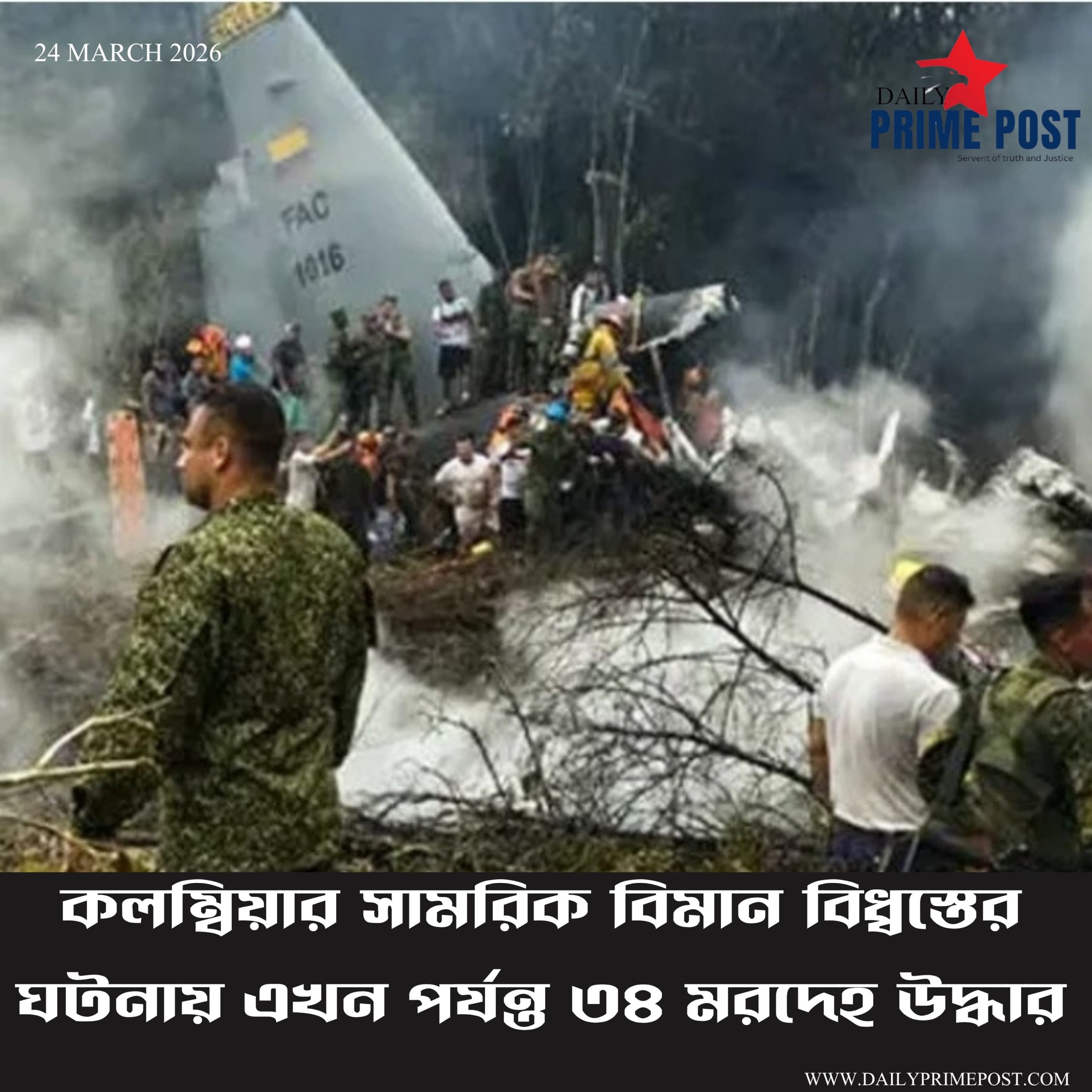 কলম্বিয়ার সামরিক বিমান বিধ্বস্তের ঘটনায় এখন পর্যন্ত ৩৪ মরদেহ উদ্ধার। – 34 bodies recovered from Colombian military plane crash.