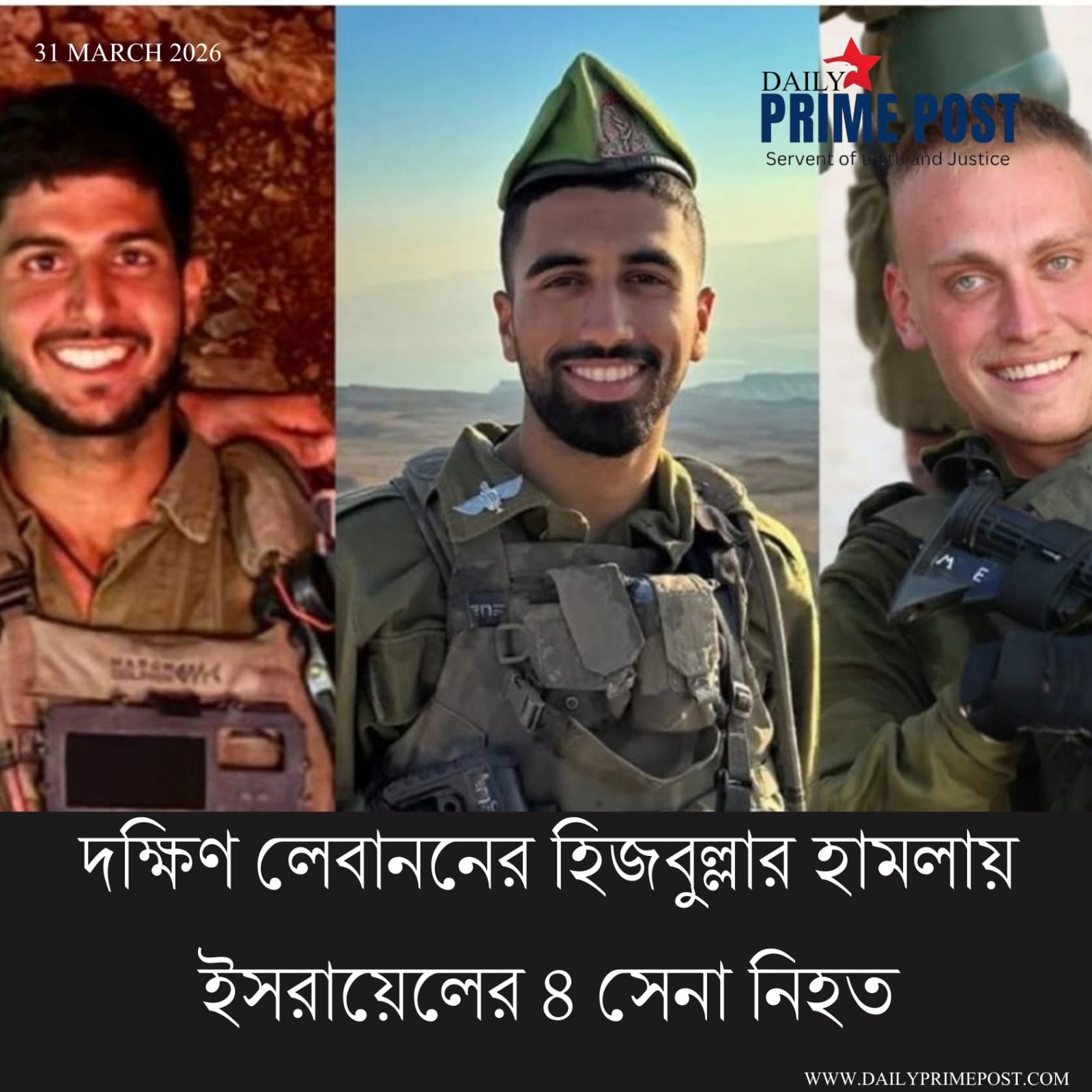 দক্ষিণ লেবাননে হিজবুল্লার হামলায় ইসরায়েলের ৪ সেনা নিহত। – 4 Israeli soldiers killed in Hezbollah attack in southern Lebanon.